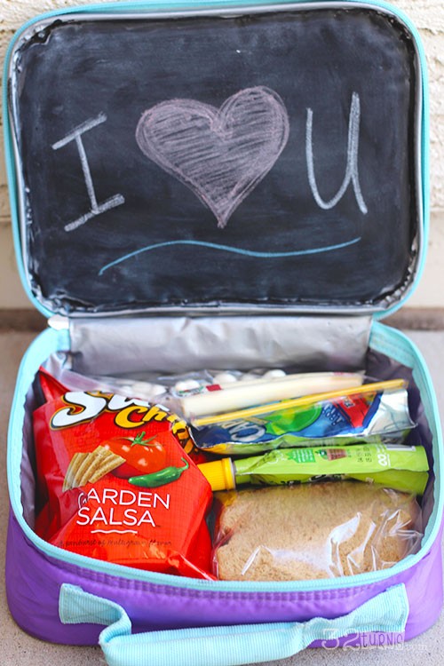 I like to leave my daughter little love notes in her school lunch box for her to find when it’s lunchtime. The school day is so very long, and I want her to have a little verbal hug from me halfway through the day to remind her that she is awesome and I love her. She likes getting these little notes from her momma! I thought it would be cute and fun to paint the lid of her lunchbox with chalkboard paint so we could write notes back and forth to each other. She will get my lunchbox notes at lunchtime and can write me a little message back and I will get it when I clean her lunchbox out after school!
